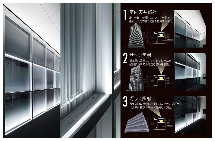 カーテンウォールの無目部材にLED照明を内蔵し、光の出口に独自設計したレンズを装着し光の照射角度をコントロールします。また、レンズを変え、照射を変えることで、天井面、ガラス面、サッシフレームの三種類の演出を可能にしました。光源は屋内側にありながら、ビル外観意匠に光の演出を加える、新しいバリエーションとなります。