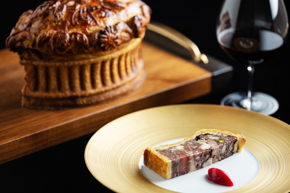 前菜の「パテ・ド・ロワ」は、鹿や猪、山鳩など、4種類以上のジビエ、トリュフ、フォアグラ、フルーツをミンチ状にし、パイ生地で包み焼き上げた料理です。細工をほどこした王様の冠のような形のままテーブルへサーブし、ゲストの目の前で切り分けます。幾層にも重ねられた断面は美しく、様々な素材が一体化し、いろいろなジビエの味が楽しめます。