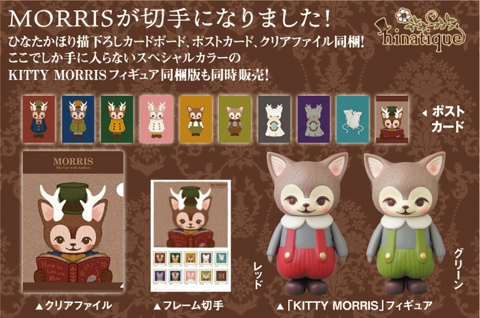 ひなたかほり描き下ろしイラストによるフレーム切手(専用台紙付)とポストカード・クリアファイルのセットと、フレーム切手(専用台紙付)とソフビフィギュア「KITTY MORRIS」の限定カラーをセットにした数量限定商品を販売いたします。