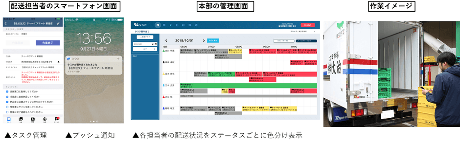 作業の進行状況は、本部の管理画面でステータスごとに色分けされます。これにより、誰がどんなルートで配送を行っているかが可視化されるので、追加配送など急な対応が必要な時も、適切・迅速に指示を出すことが可能です。また、電話で行われがちな指示出しはアプリのプッシュ通知によって文字にすることで、認識の齟齬を防ぎ、より正確な伝達を実現します。