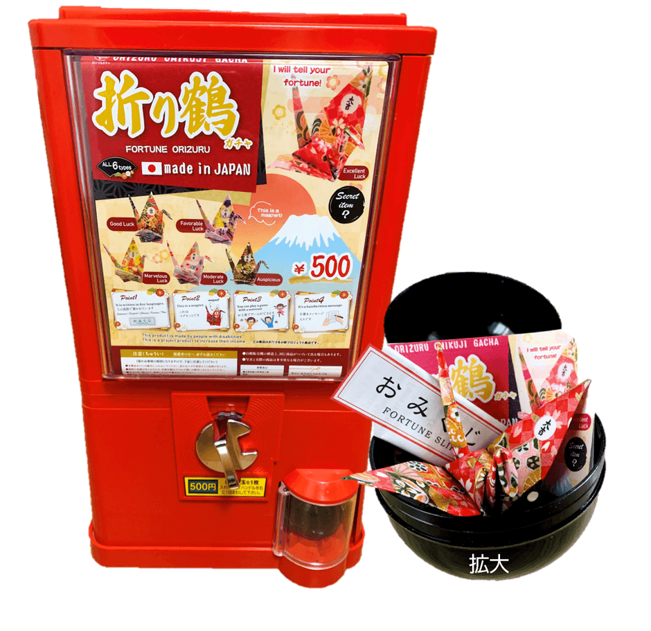 外国人観光客をターゲットにカプセル入りで持ち帰りやすいお土産として開発。「折り鶴」「おみくじ」「マグネット」などを「手書きのメッセージ」と一緒にカプセルトイに入れた商品。1コインで日本の文化、日本のおもてなしにふれることができます。カプセルトイの製作作業はすべて障害福祉事業所で製作が可能。作業工賃は現状のおよそ10倍になります。