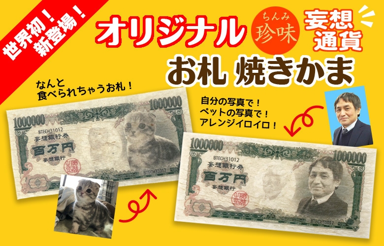 おつまみにピッタリの珍味、焼きかまにオリジナルの写真入りのお札をフードプリントする、世界で一つだけの「食べられるお札」です。会社や学校のイベントのお配りに。ビジネスツールのノベルティに。ペット交流会のご挨拶アイテムに。使い方は無限大の、超ユニークなオリジナルフードアイテムです。お札にいれる画像は、人物、またはペットなどの画像がお薦めです。