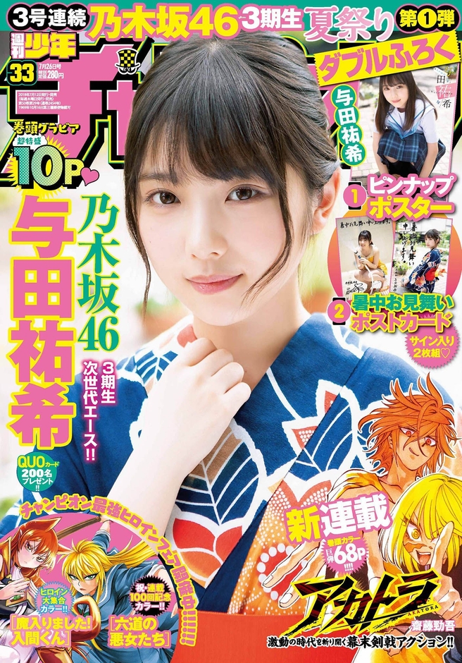 株式会社秋田書店(所在地:東京都千代田区、代表取締役社長:高橋宏和)は、発行している週刊少年漫画誌『週刊少年チャンピオン』(編集長:武川新吾)にて7月12日(木)発売の33号より、3号連続で乃木坂46の3期生与田祐希さん、山下美月さん、梅澤美波さんが表紙と巻頭グラビアを飾り、各号にピンナップポスターと暑中見舞いサイン入りポストカード付録もつくことをお知らせいたします。