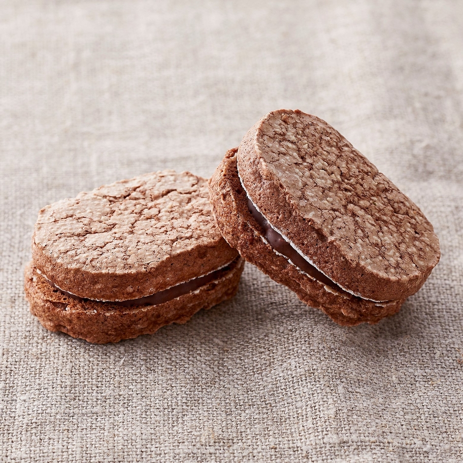 外はさくっと、中はふわっとした、カカオパウダー入りのダコワーズ生地で、ガナッシュをサンド。ガナッシュは、カカオニブとフイヤンティーヌ入りのザクっとした食感と、アーモンドペースト入りの香ばしさが楽しめます。
