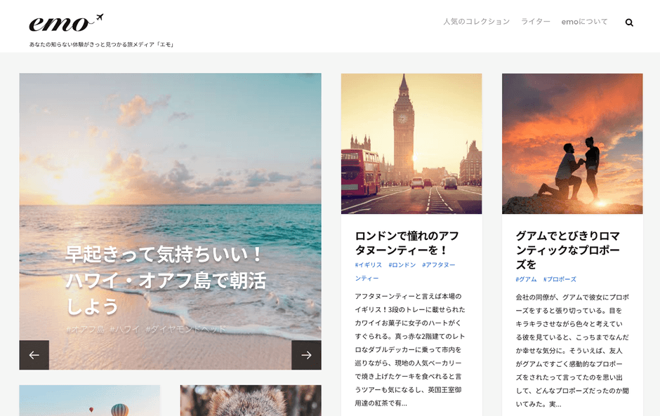 世界150カ国の現地体験型オプショナルツアー専門予約サイト『ベルトラ』を運営するベルトラ株式会社(東京都中央区、代表取締役社長:二木 渉、以下「ベルトラ」/ https://www.veltra.com/jp )は、旅メディア『emo(エモ)』を、3月28日(木)より正式にオープンいたしました。『emo』は昨年6月より一部を試験公開しておりましたが、ユニークな「直感検索機能」や「コレクション」などのコンテンツ数(体験軸のカテゴリ)も500件を超えたことから、この度のグランドオープンとなりました。