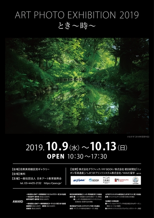 一般社団法人 日本アート教育振興会(所在地:東京都港区、代表理事:三尾洋介)は、2019年10月9日(水)~13日(日)の5日間、東京(目黒)の目黒美術館区民ギャラリーにて『art photo展(アートフォト展)2019 「とき~時~」』を開催します。入場は無料です。