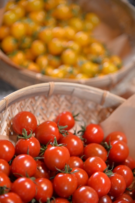 トマトやなす、ズッキーニなど、瀬戸内海の自然の恵みいっぱいに育った安心安全な旬の野菜やフルーツが、彩り鮮やかに並びます。