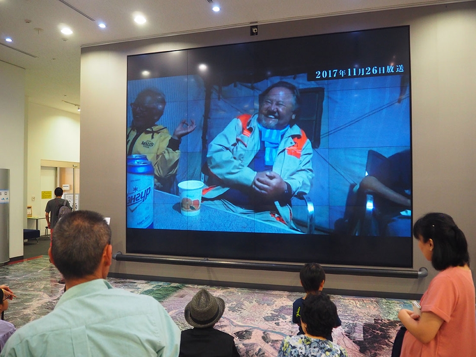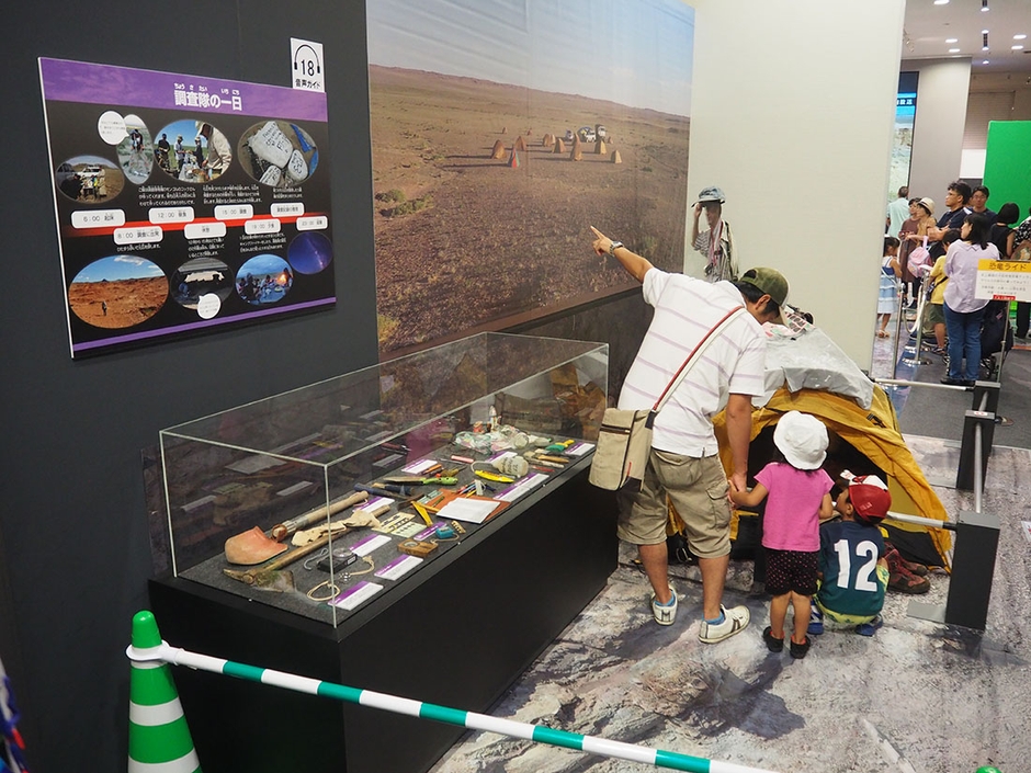 理大コーナーのタルボサウルス全身骨格標本は学生が組み上げたもので、全長約10メートル、高さ約2.8メートル。モンゴル・ゴビ砂漠での発掘調査で実際に使用したハンマーなどの道具類、隊員の衣類、テントなども展示しました。会場の大型ディスプレーでは発掘現場の生き生きとした様子が映し出されました。
