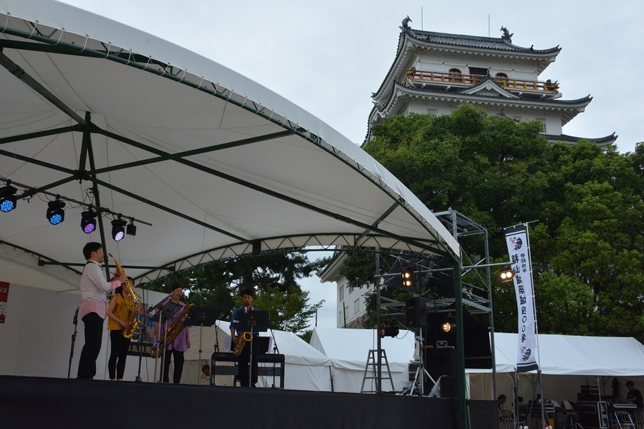 音楽祭本番にも出演する山下雅也さんや富永やよいさんが、葉加瀬太郎作曲「情熱大陸」やバッハ作曲「G線上のアリア」などを披露し、福山城にサクソフォンとピアノの音色が響き渡りました。