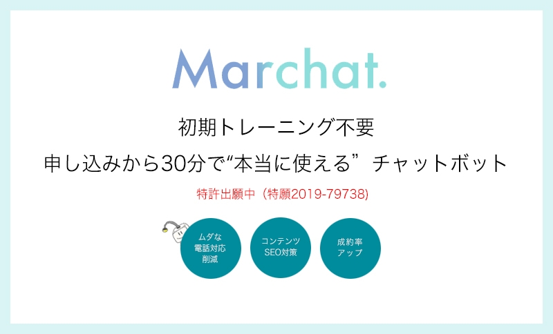 「Marchat」はプレア・メディアミックスが開発したチャット型検索エンジン(特許出願中2019-79738)を利用した世界初のサイト内検索エンジンにして、顧客動向分析ツールです。(以下、本サービス)Googleの検索結果を提供するので初期トレーニングが不要、導入コストを限りなく圧縮することができます。