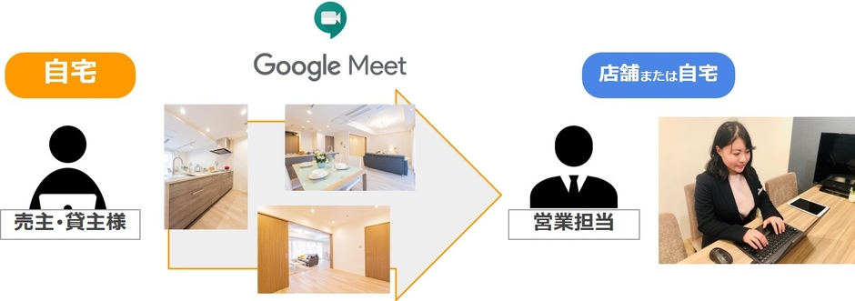 売主・貸主様に室内をライブ中継いただき、営業担当が確認