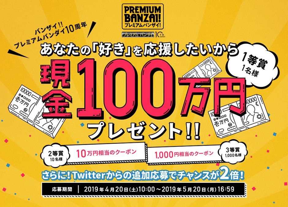 ・キャンペーン名 : プレミアムバンダイ10周年記念現金100万円プレゼントキャンペーン