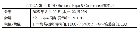 そのTICAD9にあわせて行われるイベント「TICAD Business Expo & Conference」は、日本の優れた技術、製品、サービスを国内外に発信することを目的としており、アフリカビジネスに取り組む150社以上の企業・機関が参加予定です。同イベントは「Japan Fair」「Africa Lounge」「イベントステージ」等で構成されます。