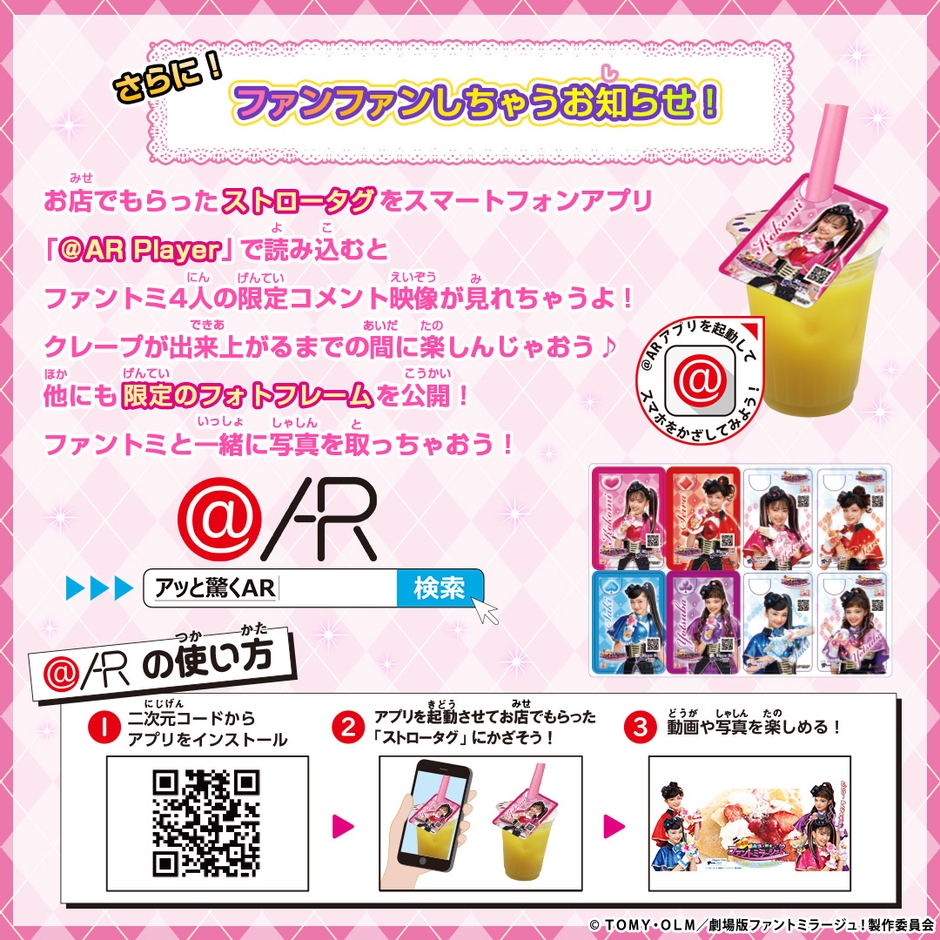 キャンペーン実施店舗において「クレープ」と一緒に「ドリンク」をご注文 の際に、合言葉「ファントミ・セット!」 を伝えると、「ファントミラージュストロータグ(ディッパーダンオリジナルデザイン)」をプレゼントいたします。