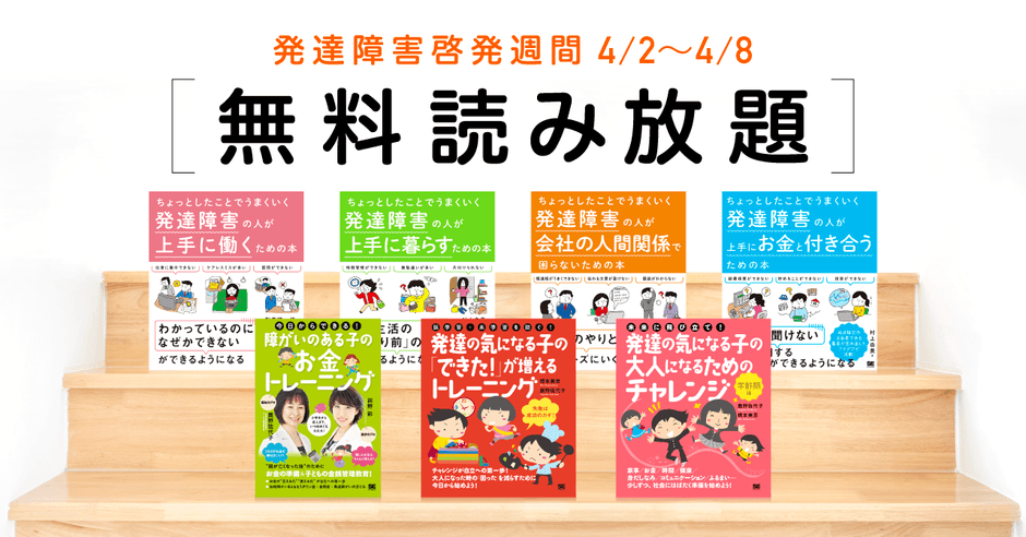 対象となるのは、発達障害を持つ人がよく抱える悩みの原因と具体的な解決方法をわかりやすく解説した『ちょっとしたことでうまくいく』シリーズ4冊と、「福祉&家計」、「福祉&療育」の専門家たちがタッグを組み、子どもたちへの取り組みをまとめたシリーズ3冊の、計7タイトルです。