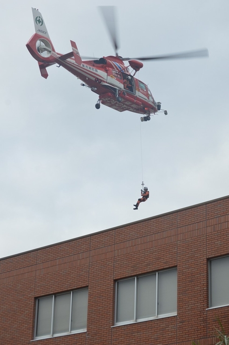 キャンパスには警報音が鳴り響き、緊張感に包まれました。木曽功学長が自衛消防隊長となり、消防機関への通報、消火、救助などを陣頭指揮。千葉市消防局の消防ヘリが出動し、火傷の重傷者を想定し、空中停止してのホイスト救助を行いました。銚子市消防本部、本学の学生消防隊も加わり、緊急車両も出て、本格的で実践型の訓練となりました。