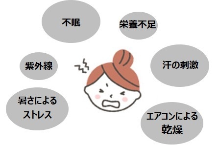 夏の紫外線、暑い時期の偏りがちな食生活、暑さによる疲れ、不眠、ストレスなど夏は肌のダメージとなる原因がたくさんあります。そして、そのダメージによる肌の修復が追いつかず「バリア機能」が弱まると、肌はとても無防備な状態に(下記URL)。