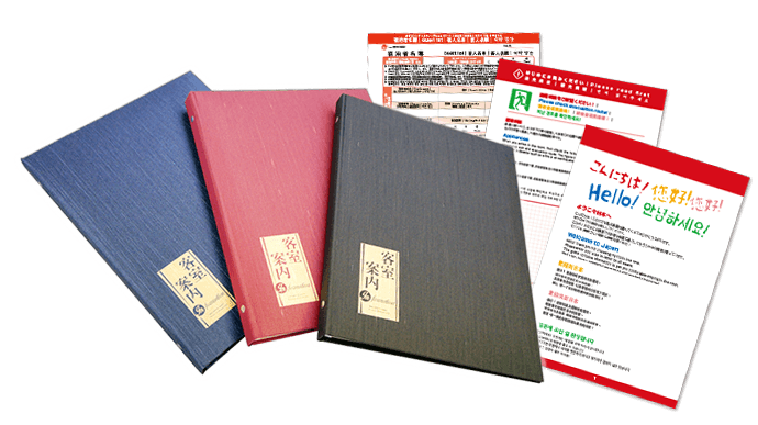 住宅宿泊事業法で求められる宿泊者名簿や、トイレ・給湯器などの文化の異なる外国人旅行者が戸惑う宿泊施設の使い方を記載したハウスマニュアル、騒音・ゴミの処理等の宿泊マナーを記載したハウスルールといった必要な書類を“客室案内”の体裁で高級ファイルにセットして、民泊の運営をサポートいたします。