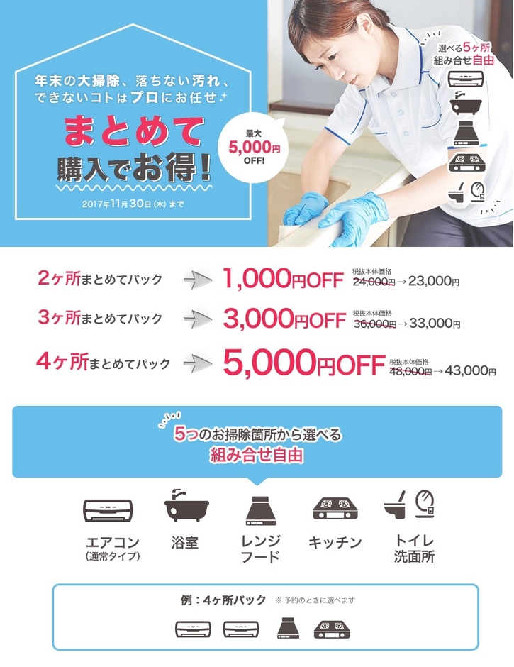イオングループで家事支援事業を展開する株式会社カジタク(東京都中央区、代表取締役社長:澁谷 祐一、以下「カジタク」)と、株式会社VOYAGE GROUP(東京都渋谷区、代表取締役社長兼CEO:宇佐美 進典、以下「VOYAGE GROUP」)の連結子会社で、家事支援サービスのネット販売事業を展開する株式会社VOYAGE NEXUS(東京都渋谷区、代表取締役:戸崎 康之、ボヤージュネクサス)が共同運営する家事の宅配サービス「カジタク」( https://www.kajitaku.com/ )では、2017年10月17日より、最大5,000円割引きになる大掃除キャンペーンを開催いたします。期間中、自分でお掃除することが難しく、大掃除で特に人気の5箇所の中から、2箇所以上のセットでご注文いただくと、1,000円から最大5,000円割引きになります。