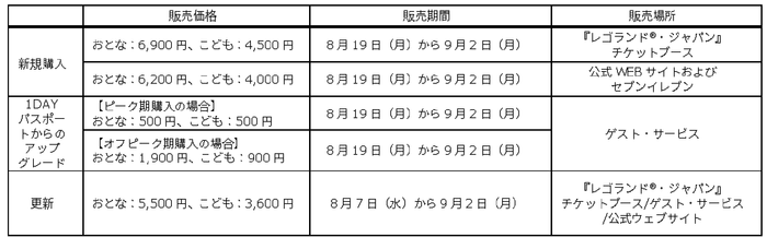 【価 格】:年間パスポート・スタータ―に関する各価格については、以下の表を参照。