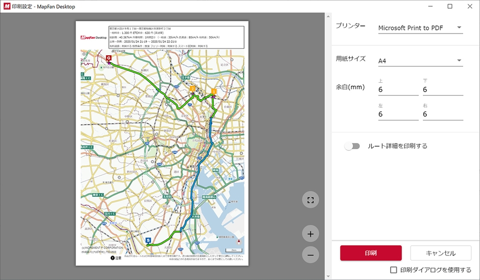 交通費精算時に必要な距離測定・料金算出や、営業・配送のルート確認、地図の印刷など、ビジネスシーンでの利用に便利な、PCにダウンロードしてお使いいただく地図ソフトです。日報や報告書への地図添付など、社内での業務目的による地図の印刷・複製※1も追加料金は一切かかりません。