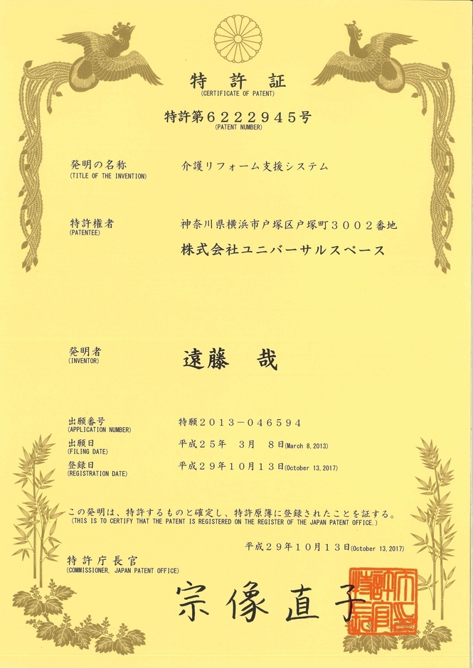 株式会社ユニバーサルスペース(本社:神奈川県横浜市戸塚区、代表取締役:遠藤 哉)は介護リフォームにおいて要介護者の要望に対して迅速に対応でき、介護リフォームのビジネス展開を一層促進できる日本初のビジネスモデル特許を取得したことを発表いたします。