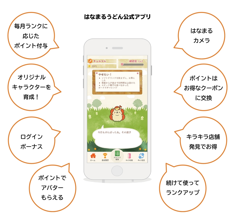 はなまるチャレンジの達成などによって獲得したポイントは、クーポンのほか、各キャラクターの着せ替えアイテムとも交換することが可能です。また、オリジナルキャラクターと一緒に写せるカメラ機能を搭載しています。