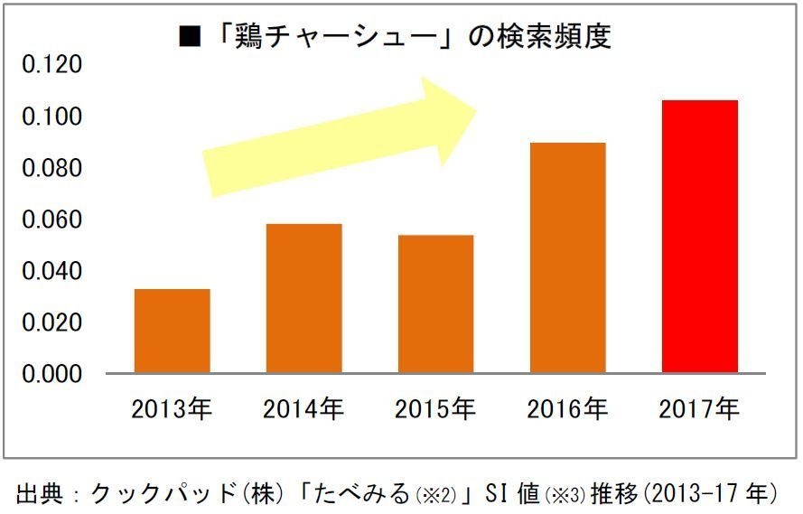 近年、高たんぱく・低脂肪な食材として鶏むね肉が注目されています。鶏むね肉を使ったメニューの「鶏チャーシュー」の人気も高まっており、日本最大の料理レシピ投稿・検索サービス「クックパッド(※1)」でも「鶏チャーシュー」の検索が増えています。