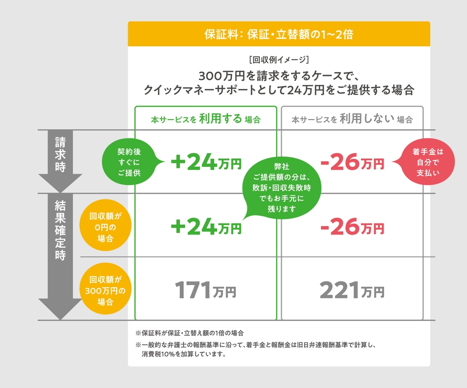 そのため、敗訴した場合等でも、お客様は、弁護士の着手金の分損をしてしまうリスクがなく、クイックマネーの分、最終的な収益がプラスになります。
