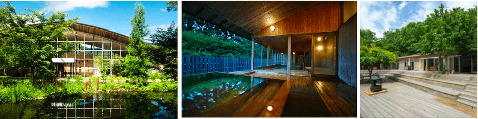 森の中の全長200メートルのウッドデッキを歩くと、箱根の深い緑に包まれまるで森の一部になったかのように感じる宿泊者限定の総檜の浴室の天然温泉「ONSEN」があり、大きく開放された窓から四季折々の景色をお楽しみいただけます。