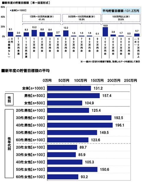 続いて、全回答者(1,000名)に、新年度の貯蓄目標額を聞いたところ、「0円(目標額なし)」が9.1%、「1万円~50万円未満」が41.4%、「50万円~100万円未満」が16.9%、「100万円以上」が30.6%となりました。1年で100万円以上の貯蓄をしたいと考えている人が3割いるようです。また、0円との回答も含めた平均貯蓄目標額は131.2万円となりました。