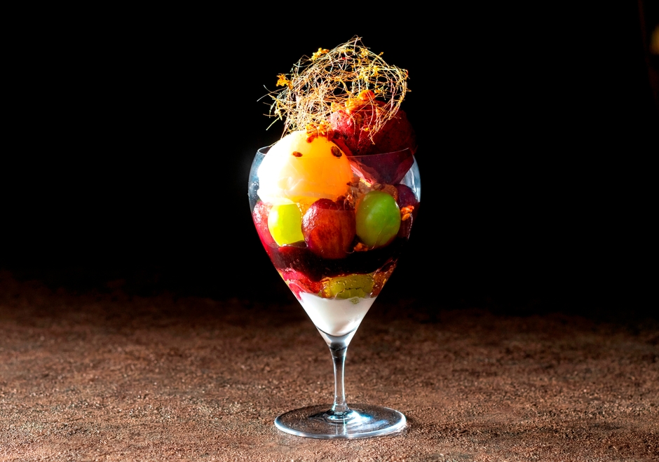 「パルフェ レザン~葡萄のパフェ~」は、選りすぐりのシャインマスカットやピオーネを贅沢に盛り合わせた、葡萄の豊かな甘みとみずみずしさが丸ごと味わえる逸品。巨峰のソルベ、マスカルポーネチーズアイス、白ワインのジュレ、パンナコッタなどを美しく重ねた大人のための極上パフェです。キャラメリゼしたアーモンドの香ばしさや塩クランブルの食感、サワーカスタードクリームの爽やかな酸味がアクセントになり、絶妙なハーモニーを奏でます。金箔をあしらった飴細工が彩りを添える期間限定メニューです。