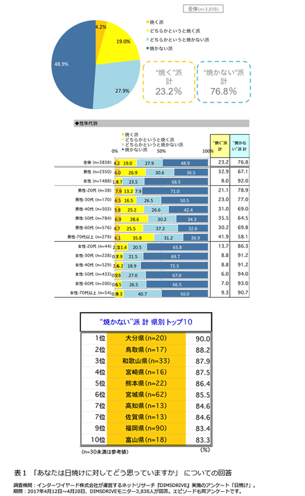 焼かない理由…女性は「肌トラブル」回避、男性は「皮膚ガン」を心配する人も