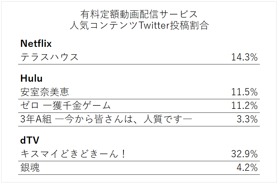 今回は定額動画配信サービス人気5社のTwitter投稿を調査しました。