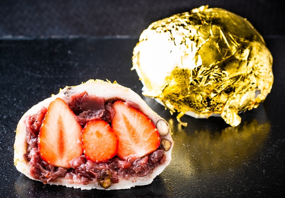ジャンボサイズのいちご豆大福を丸ごと金箔で包みあげてご提供!