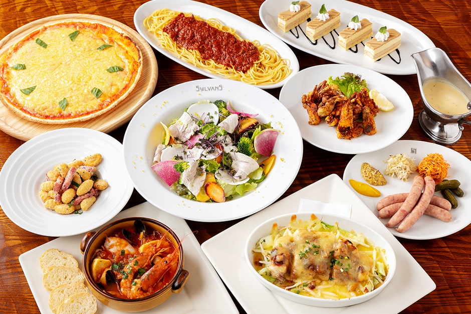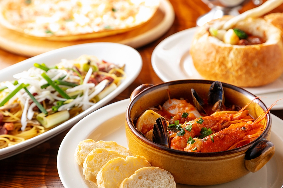 シルバンズの冬限定メニューは、富士北麓の冬にぴったりの、心と体が温まる料理が揃います。おつまみには柚子胡椒を練り込んだピリ辛の「柚子胡椒のソーセージ」や、トスカーナ州の港町リボルノの名物料理「カチュッコ」など、ビールとの相性が抜群の料理が揃います。シルバンズ自慢の釜焼きピザの冬限定メニューは、ホワイトソースを塗った生地にたっぷり具材をのせて焼き上げた「ズワイガニと蓮根のピザ」、4種類のチーズを使った「クワトロフロマッジ」です。パスタには、「ほうれん草のフェットチーネ」や「鴨と葱のスパゲティー」が新登場。メイン料理では、冬の定番「田舎パンのビーフシチュー」や、富士桜ポークを豪快に使った「富士桜ポークのチーズ焼き」がおすすめです。