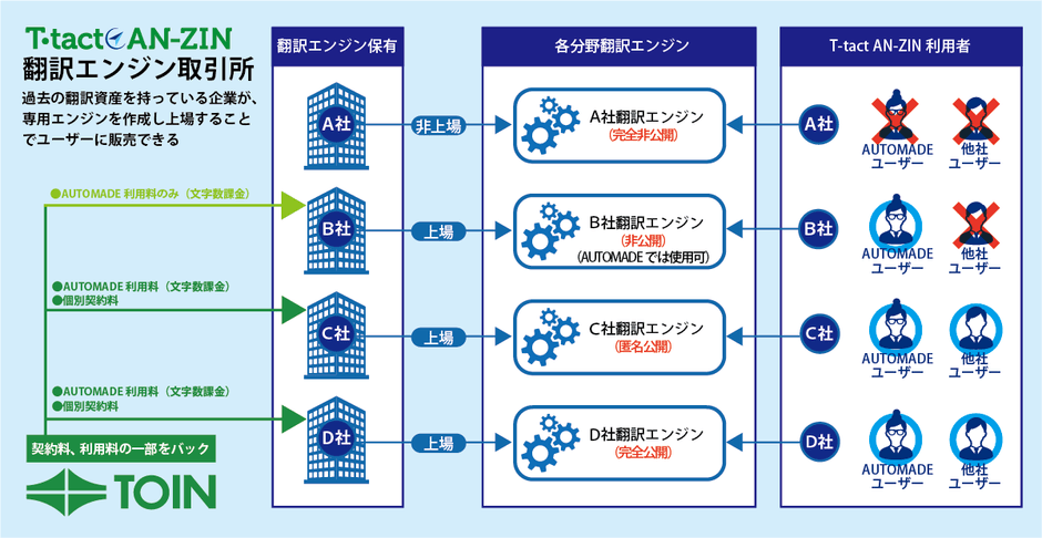 翻訳エンジンに過去に翻訳したデータを機械学習させることで、AIが個別の特有表現や用語を選択する、専用の翻訳エンジンを作成することができます。これをアダプテーションと呼び、この技術を用いれば、業界ごとや会社ごとの翻訳エンジンを作成することができます。翻訳エンジン取引所は、作成した翻訳エンジンを上場(AN-ZINユーザーに公開)することで、十印が提供するT-tact AN-ZINのユーザーがその翻訳エンジンを使用することができます(利用にはオプション契約が必要となります)。翻訳エンジンを上場した企業には、ユーザーの使用料の一部が支払われます。