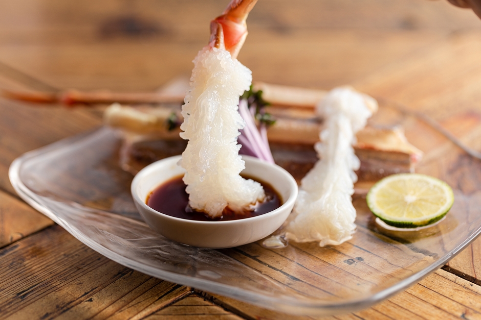 香住の紅ズワイガニのほぐし身・カニ味噌・飛び子・いくらを楽しむ「カサバ盛り」、卵をたっぷり蓄えた雌の紅ズワイガニ「背子ガニのボイル」、カジュアルに楽しめる「カニピザ」「カニサラダ」などのカニメニューはもちろん、香住の名産鮮魚「のどぐろの刺身」や幻の海老「モサエビの刺身」、さらには創業140年超の水産加工会社「北由商店」が提供する、へしこ料理や、塩だけで作った絶品の干物など、多種多様な香住の名物を楽しむことができます。