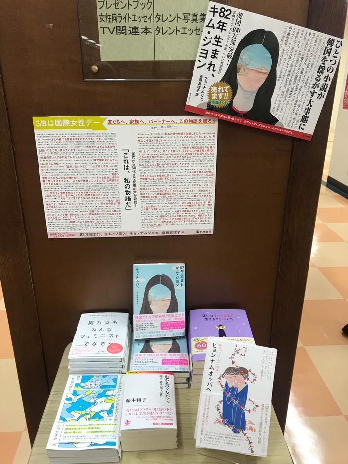 3月8日 国際女性デーを前に書店店頭も盛り上がり 異例の大ヒット小説『82年生まれ、キム・ジヨン』特大パネル登場 「あなたのことばで顔をつくろう」