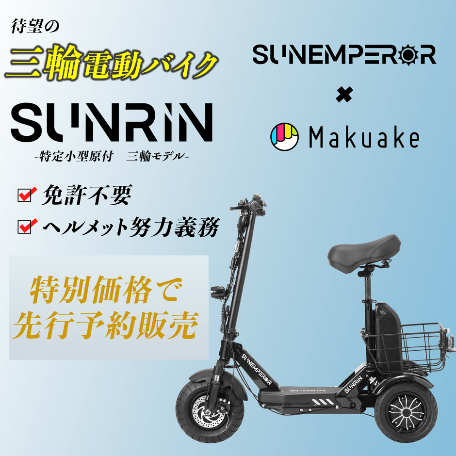 愛知県名古屋市に拠点を置く、電動モビリティメーカーのSun Emperor(サンエンペラー)は、三輪モデルの特定小型原動機付自転車【SUNRIN】を発表。2024年10月20日(日)より、応援購入サービスMakuakeにて最大30%オフで先行応援販売を開始しました。