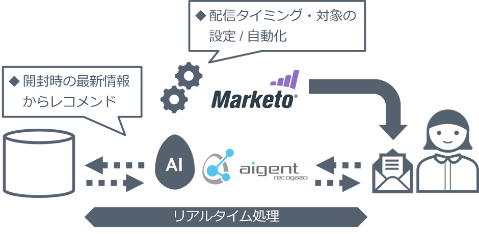リアルタイム・レコメンドメールサービス「レコガゾウ」は、従来のレコメンドメールで大きな課題となっていた「導入ハードルの高さ」や「タイムラグ」などの問題を解消し、メール開封時にリアルタイムでレコメンド結果を表示します。「アイジェント・レコメンダー」のオプションサービスとして組み合わせることで、より簡単に、リアルタイム性の高いレコメンドメールを実現しました。