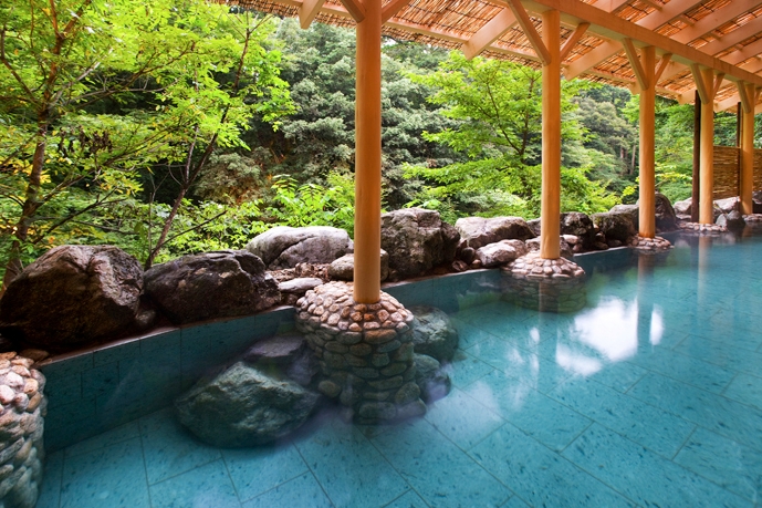 山中随一の景勝・こおろぎ橋ほど近く、マイナスイオンたっぷりの森に佇むような立ち湯露天風呂と開放感溢れる野天風呂をご利用いただけます。客室には、巾着&足袋ソックスのご用意、全湯処には、バスタオルや化粧水などのアメニティ類を完備。鶴仙渓の遊歩道1.3km~ゆげ街道の散策がてらに手ぶらでどうぞ。