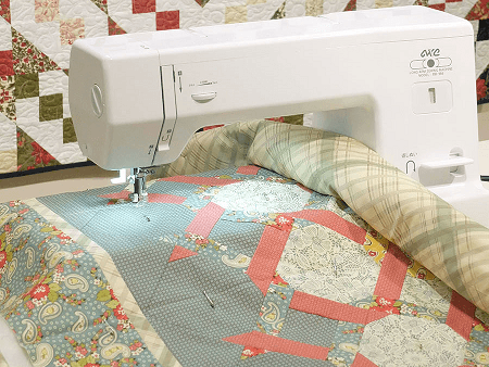 家庭用ミシンの一般機能として、両手が自由に使えるフットコントローラー、自動針穴糸通し機能、LEDライト、などを搭載していることに加え、ミシンキルトのプロフェッショナルな作業に必要な「押え圧力調整機能」、送り歯を下げて自由にフリーモーションや刺しゅうが手軽にできる「ドロップフィード」、ひざで押えの上げ下げが可能になり作業効率がぐんと上がる「ニーリフター(ひざ上げレバー)」、針の振り幅・縫い目の長さ調節ができる「縫い目調節ダイヤル」を搭載しました。