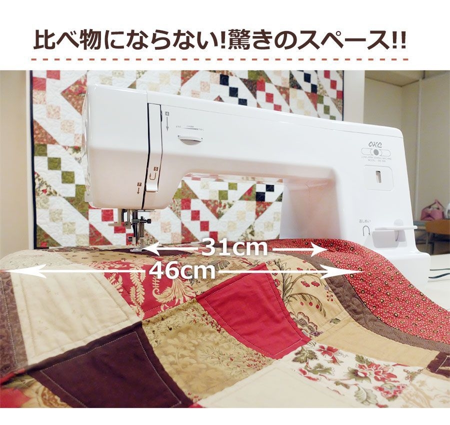 ミシンキルトには欠かせない長いロール生地でもすっぽり入る驚きのフトコロサイズ31cm、テーブル面広さは46cmと家庭用ミシンでは最大級の広さで、ソファカバー、カーテン等の大物縫製でも自由に動かせるフトコロサイズを実現しました。