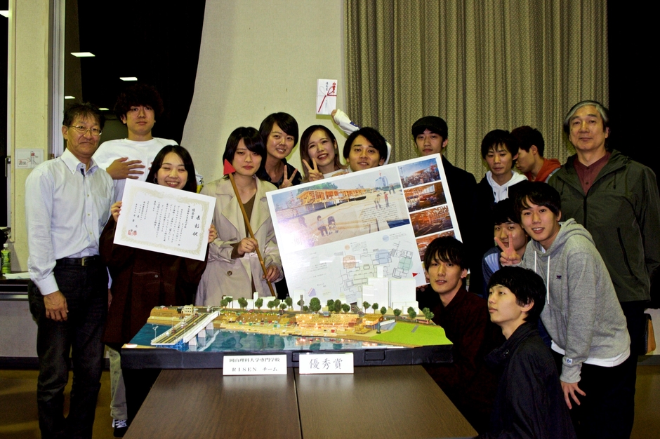 岡山建築設計クラブ主催の設計競技会「第26回ワンデーエクササイズ」が2019年11月26日、岡山市北区の勤労者福祉センターで開催され、岡山理科大学専門学校(岡山市北区半田町)建築学科専攻科・昼間部1・2年合同チーム(学生15人)の作品「一期一会」が優秀賞を受賞しました。