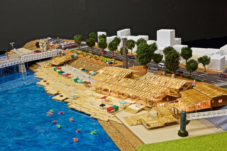 「一期一会」は、京橋の旭川河畔に残る石の雁木をモチーフに、古本や音楽のカフェ・バー、多目的ホールを設けて、旭川の魅力を身近に感じられるよう、水際に人々を誘う階段状の建築を提案。高い評価を受けました。