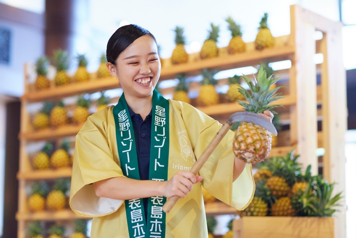 ピーチパインは小ぶりな果実に果汁がたっぷりで、果肉は白っぽく、香りは桃のようなさわやかさが特徴です。また、パイン特有の繊維感もなく、芯の部分まで食べられます。さらに、収穫時期が非常に短いため、生産量が少なく、市場に出回ることも珍しいため「幻のパイン」ともいわれています。そんなピーチパインを祭り期間中、ホテルロビーで振る舞うので毎日味わえます。