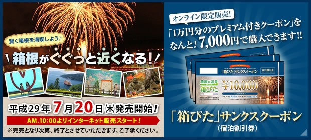 箱根温泉旅館ホテル協同組合が運営するオフィシャルサイト「箱根の温泉公式ガイド『箱ぴた』」では、日ごろのお客様に感謝の気持ちを込めて、宿泊割引券「箱ぴた」サンクスクーポンを7月20日(木)よりインターネットで1,000枚限定販売いたします。お一人様4枚まで購入が可能です。ご利用のお客様は、7,000円でご購入いただいた「箱ぴた」サンクスクーポンを、10,000円分の宿泊割引券として箱根温泉旅館ホテル協同組合加盟宿泊施設の宿泊時にご利用できます。