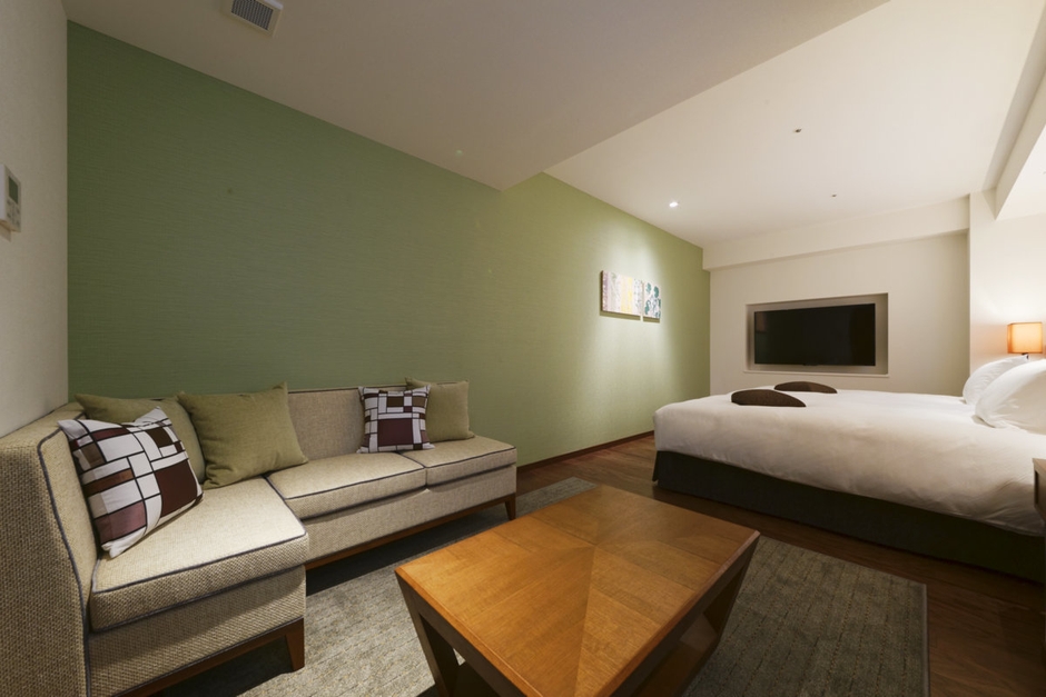 180cm幅のキングサイズベッド・壁際のソファ・厳選された備品の数々で、お部屋で過ごす時間を楽しく感じていただければと願っております。