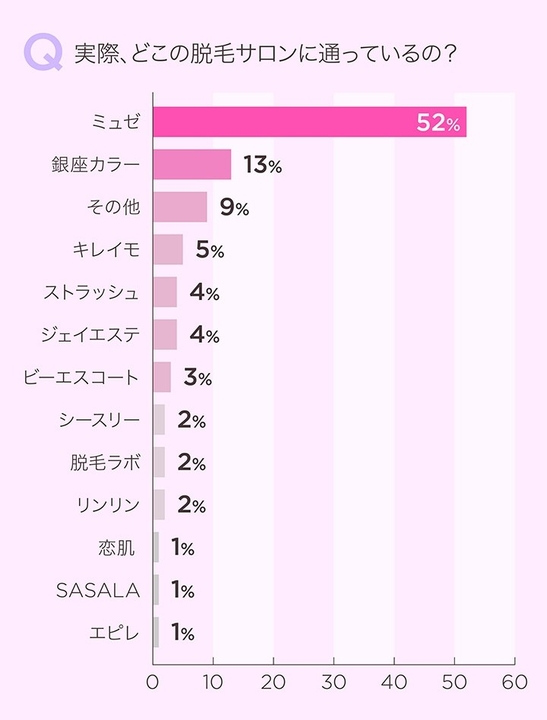実際みんなが通っている脱毛サロン、1位はミュゼプラチナムで全体の52%!